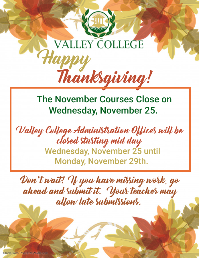 Course Close Dates & Administration Offices Closed for Thanksgiving