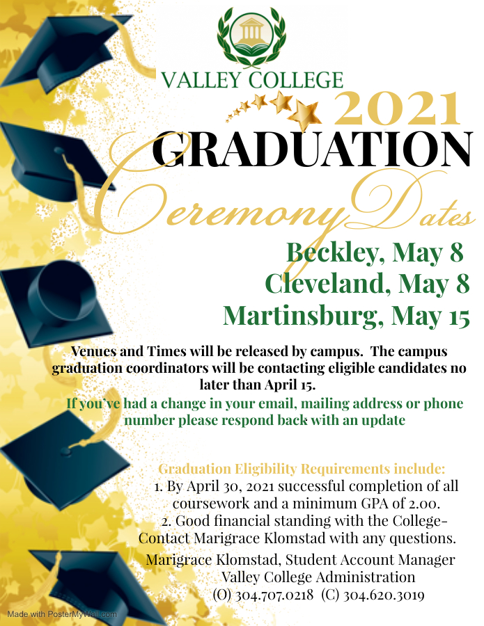 The Valley College Campuses have announced their upcoming Spring Graduation dates!! (See below) There are a lot of details still being confirmed, but we wanted you to be able to place a save the date in your calendars. Details such as the setting (drive-in/drive-through, etc.), the time, and speakers, and more, are not yet confirmed. However, if you are an eligible graduate your local campus will be reaching out to you to confirm your participation in the ceremony by mid-April. Please see below for the dates!