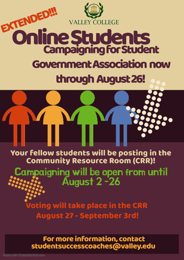Hi Online Valley College Students! We are extending the Online Student Government Association (OSGA) campaigning period until August 26!