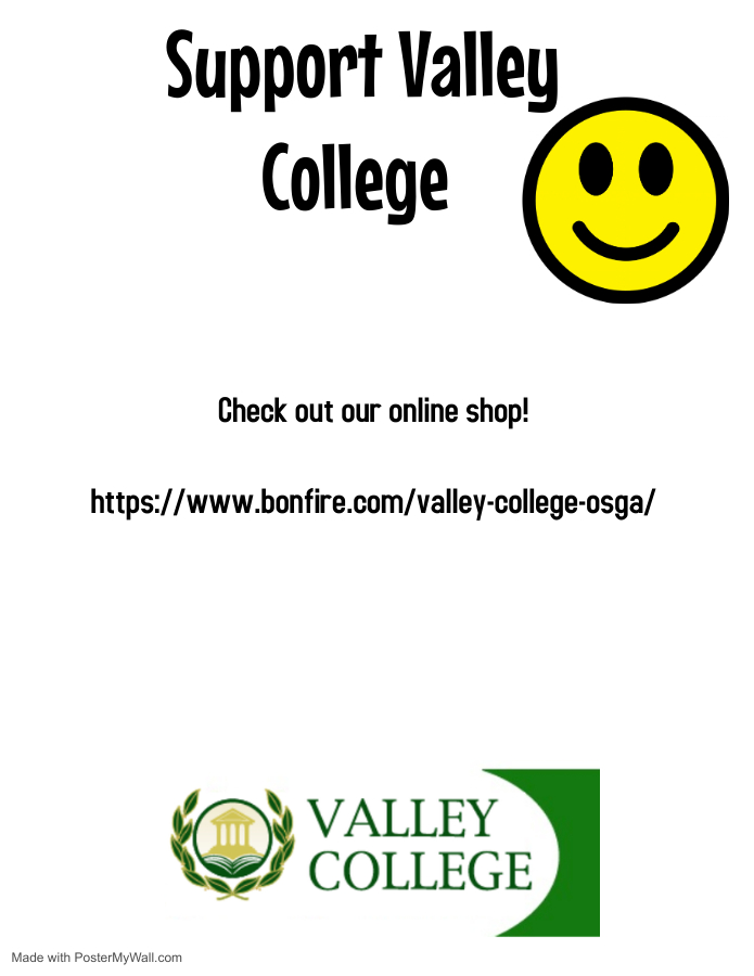 The Valley College Online Student Government Association would like to introduce you to the OSGA Valley College Shop!   You can purchase T-shirts, hoodies, and tanks with the Valley College logo and a small portion of your purchase goes to support the next OSGA community event.
