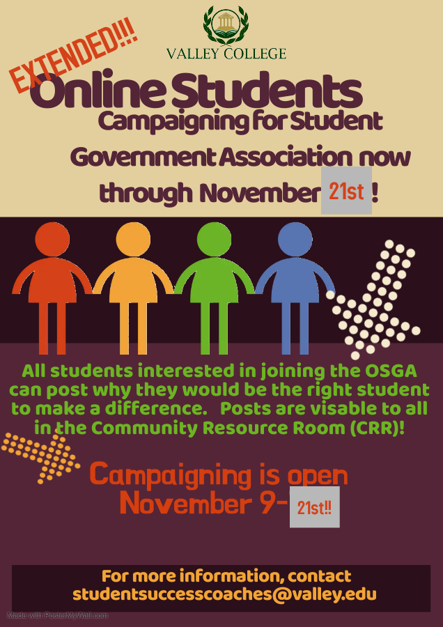 The Online Student Government Association (OSGA) is extending the opportunity to campaign to be part of the group!  The OSGA is thrilled with those who are already campaigning and they voted to open it until November 21st to see if more students would like to join in!