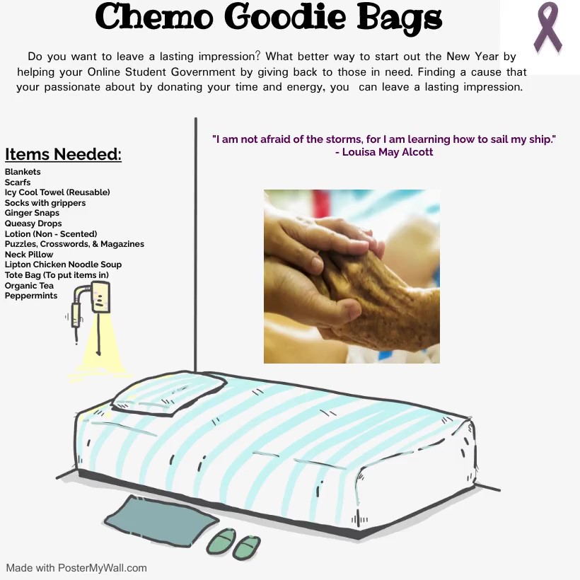 It's a new year~ and a new time to give and encourage others! The Online Student Government Association (OSGA) is accepting donations at the local campuses for Chemo patients through January 21st. The front desk will have a box or specific location for donations.