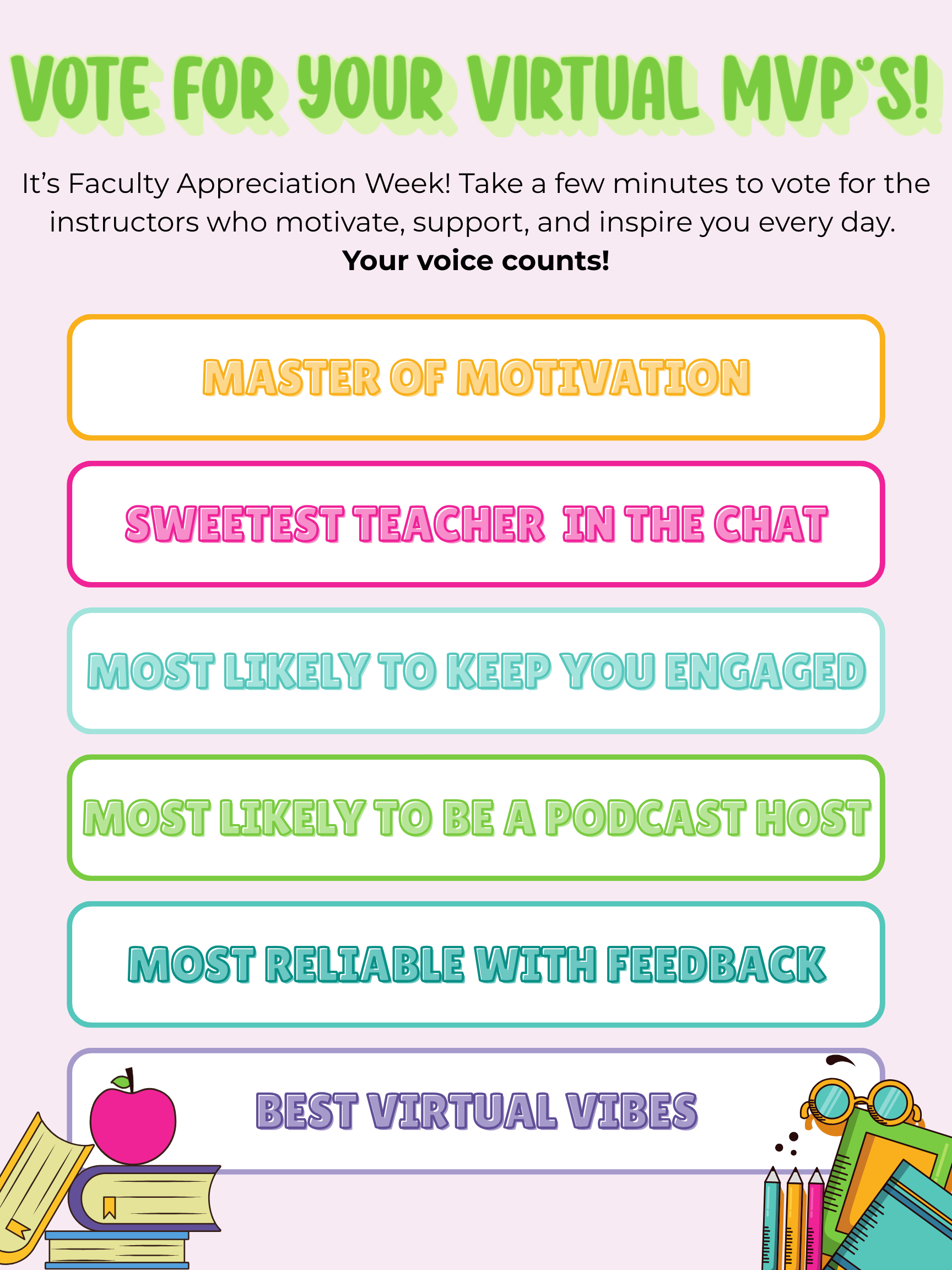 From “Master of Motivation” to “Best Virtual Vibes,” let’s show our teachers some love!